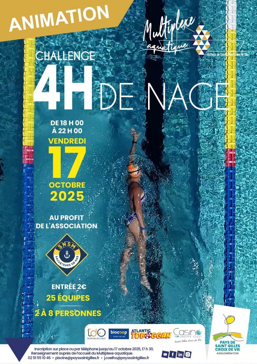 Inscription au Multiplexe aquatique ou par téléphone au 02 51 55 10 46 jusqu'au 17 octobre 2025, 17 h 30.