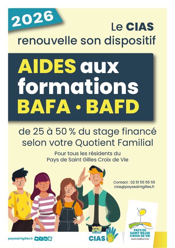 Le Centre Intercommunal d’Actions Sociales (CIAS) du Pays de Saint Gilles Croix de Vie Agglomération renouvelle son engagement en faveur de la jeunesse et de l’animation en proposant une aide financière pour les formations au BAFA (Brevet d’Aptitude aux Fonctions d’Animateur) et au BAFD (Brevet d’Aptitude aux Fonctions de Directeur).