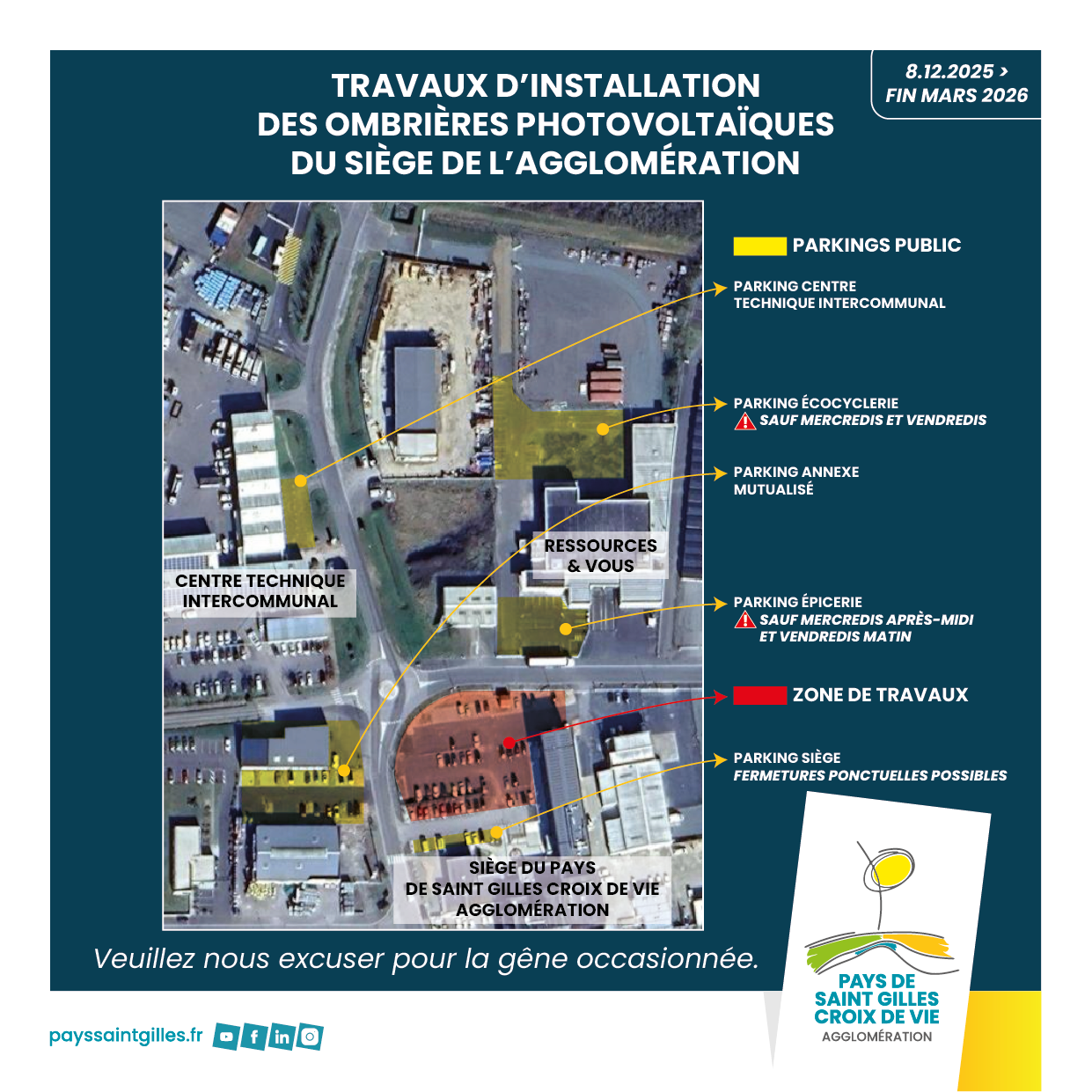 À partir du lundi 8 décembre 2025, des travaux d’installation d’ombrières photovoltaïques débuteront sur le parking principal du siège de l’Agglomération pour une durée de 14 semaines.